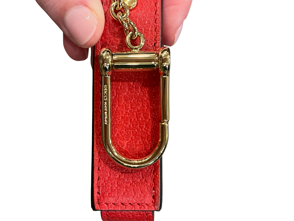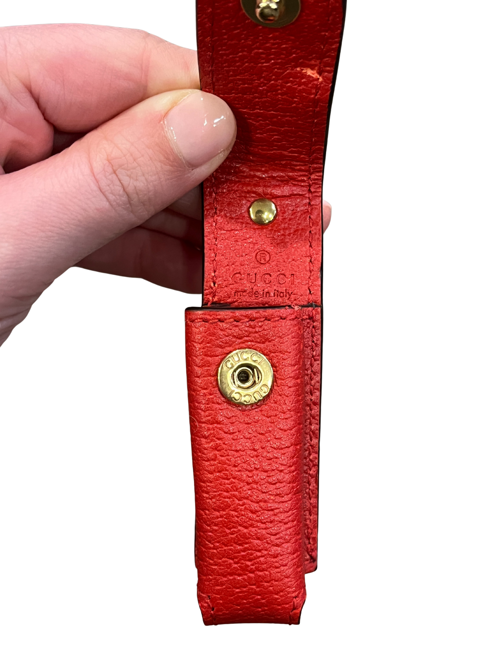 Red leather Gucci GG lipstick case with snap closure.