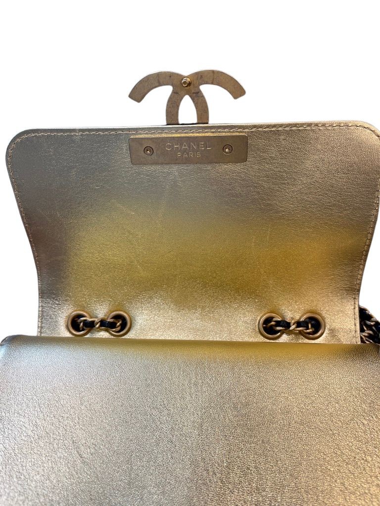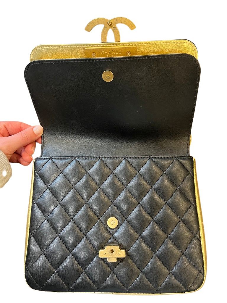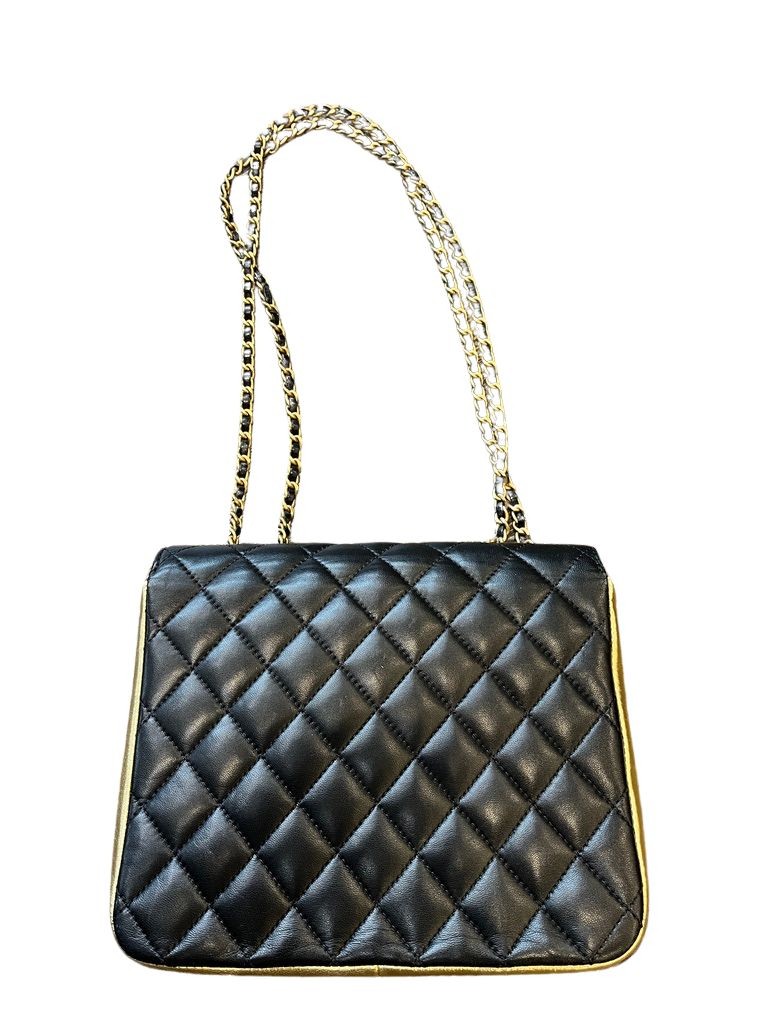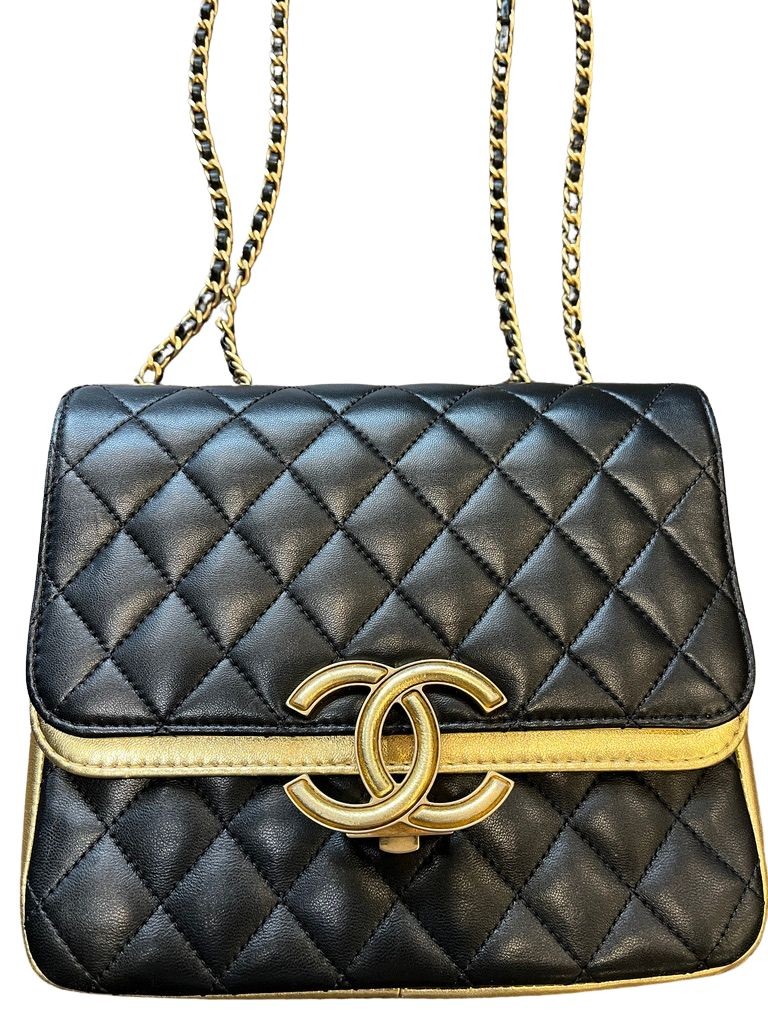 Features black quilted leather with gold accent leather, gold CC hardware, a long gold chain strap with leather insert, front clasp CC closure.