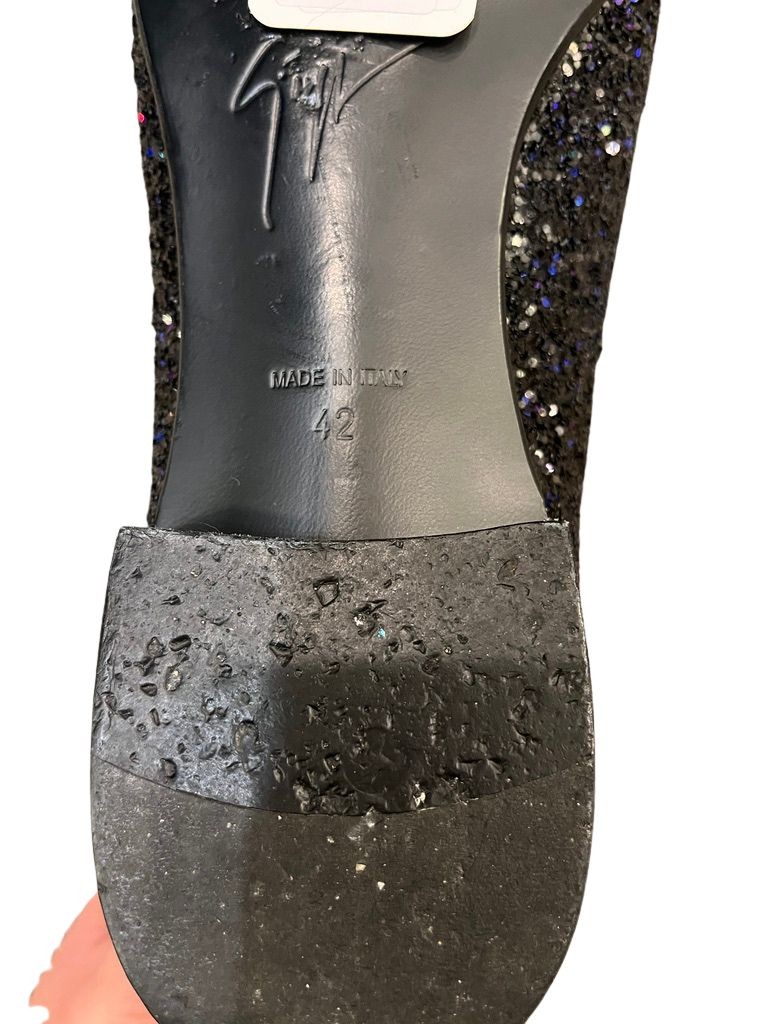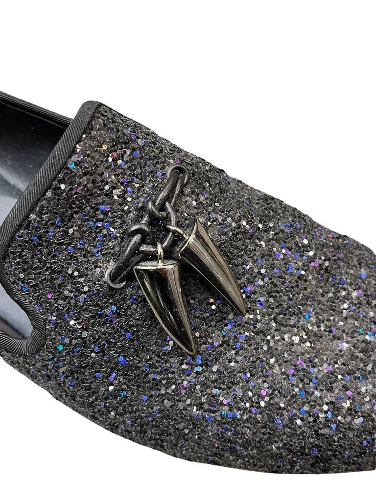 Black glitter upperMetal 'shark tooth' accessoryLeather sole with logoMade in ItalyExcellent condition
